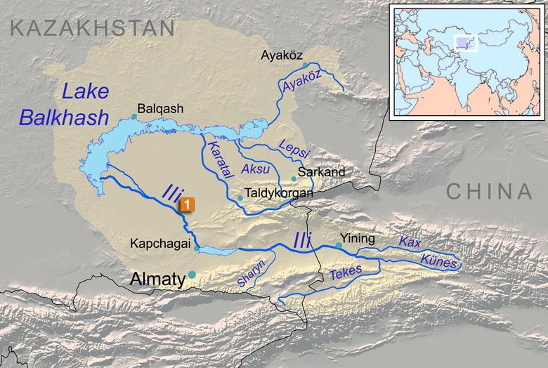 Kazakstan som är världens 9. största land var, medlem i fd Sovjetunionen. Det finns ett flertal jättesjöar i landet utan något havförbindelse, likaså Kaspiska havet, Aralsjön och Balqashsjön. Den senare spelar en viktig roll som avrinningsområde till en av Asiens längsta flod, den 140 mil långa Ili.
